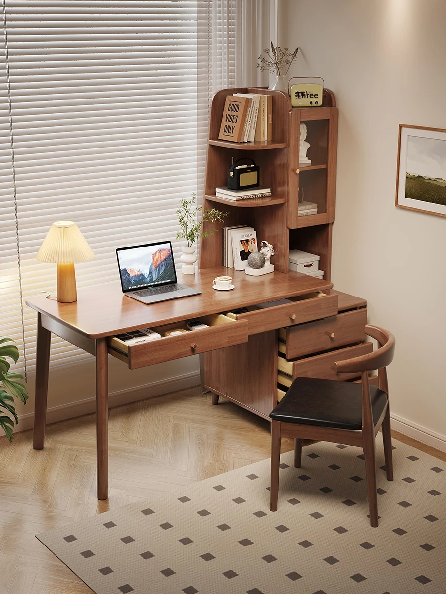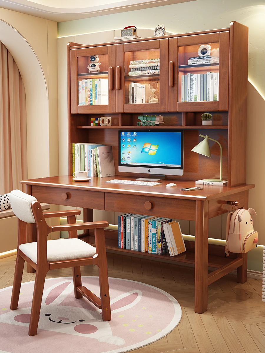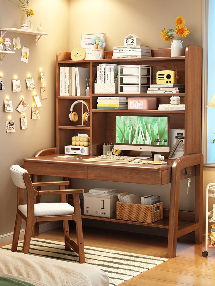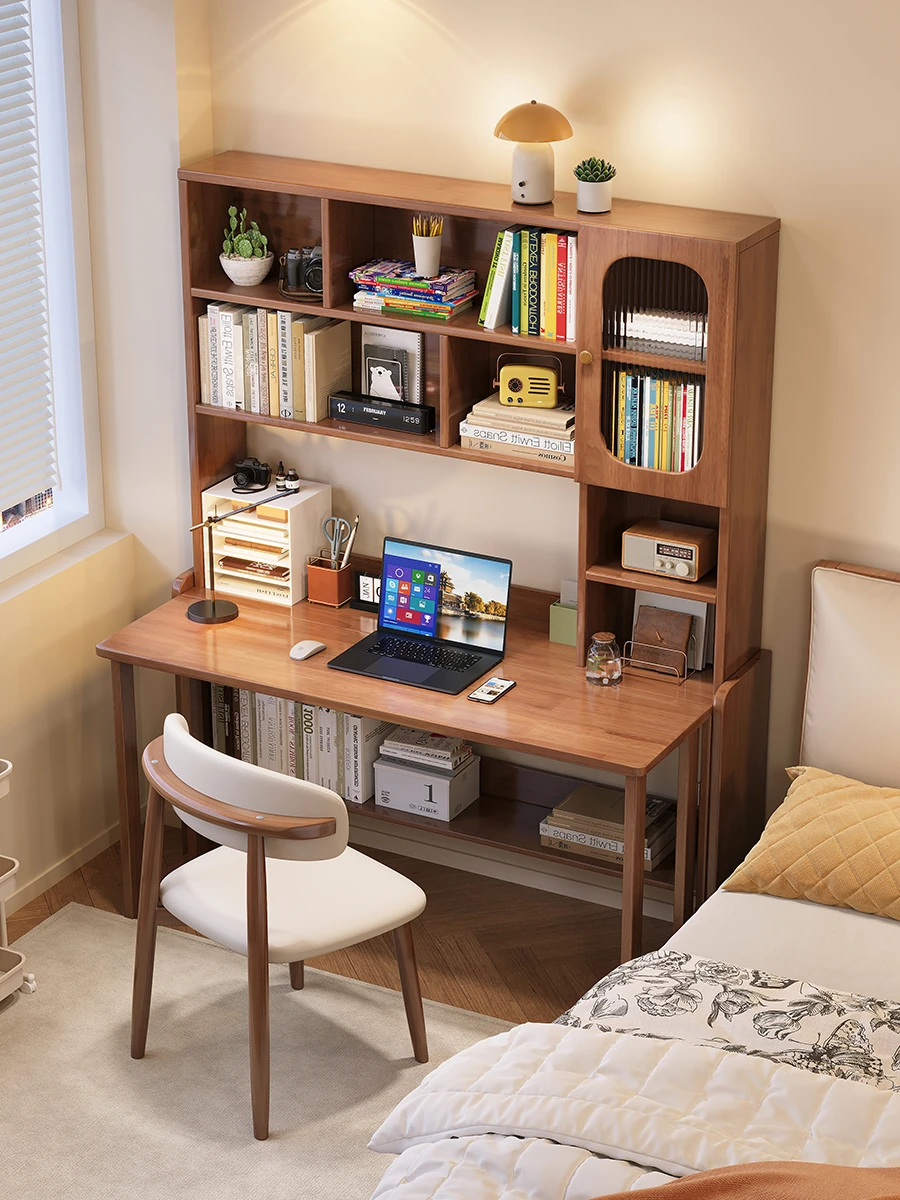 Solid Wood Desk and Bookshelf Combo - Stylish Bedroom Side Table for Home Use, Perfect Kids' Study Desk, Space-Saving Office Computer Table for Small Spaces