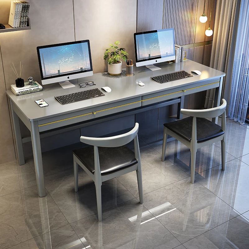 Elegant Modern Solid Wood Desk - Minimalist Home Office Computer Table, Rectangular Double Writing Table for Study and Work with Chairs