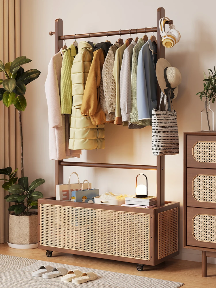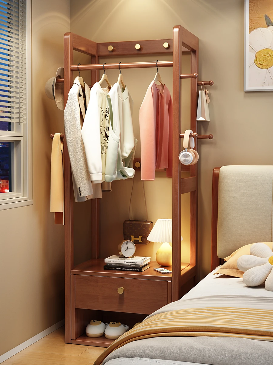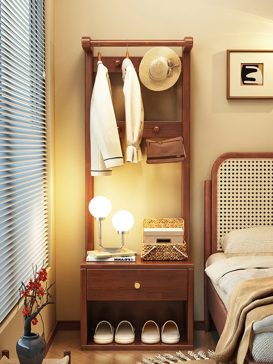 Elegant Solid Wood Coat Rack - Versatile Floor-standing Bedroom Storage Solution with Built-in Nightstand and Simplified Design, Perfect for Small Spaces!