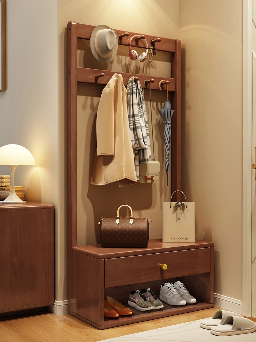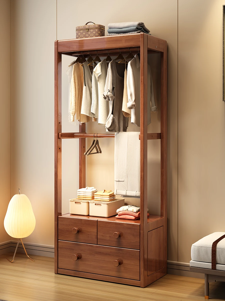 New Chinese Style Solid Wood Coat Rack and Storage Cabinet - Floor Standing Modern Minimalist Shelving Unit with Drawers for Bedroom Organization