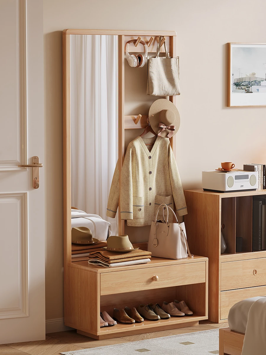 Elevate Your Entrance: Solid Wood Dressing Mirror with Coat Hanger and Shoe Bench - Stylish and Functional Home Entryway Rack with Integrated Mirror for Bedroom Storage