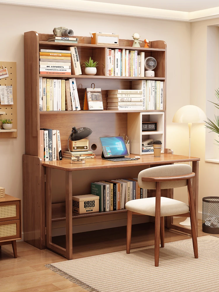 Scandinavian Solid Wood Folding Desk and Bookshelf Combo - Ideal Study Table for Students and Small Homes, Perfect for Bedroom or Home Office Use.