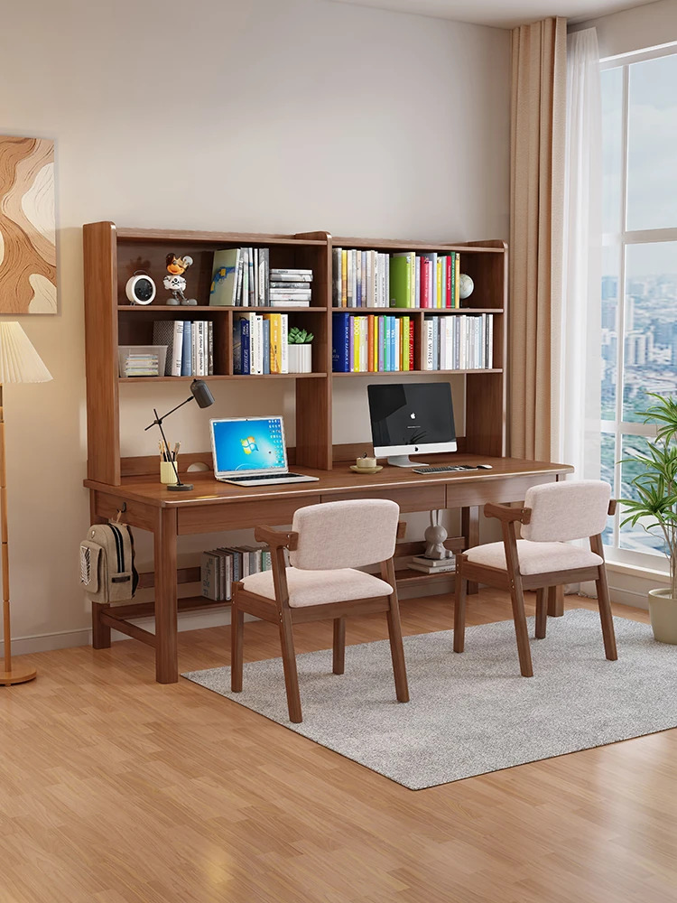 Modern Minimalist Solid Wood Double Desk and Bookshelf Combo – Versatile Computer Table and Storage Solution for Bedroom and Extended Children's Study Area