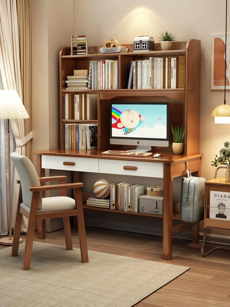 Solid Wood Desk Bookshelf Cabinet Combination - Stylish Home Office Solution for Kids & Teens, Ideal for Bedroom Study and Homework.