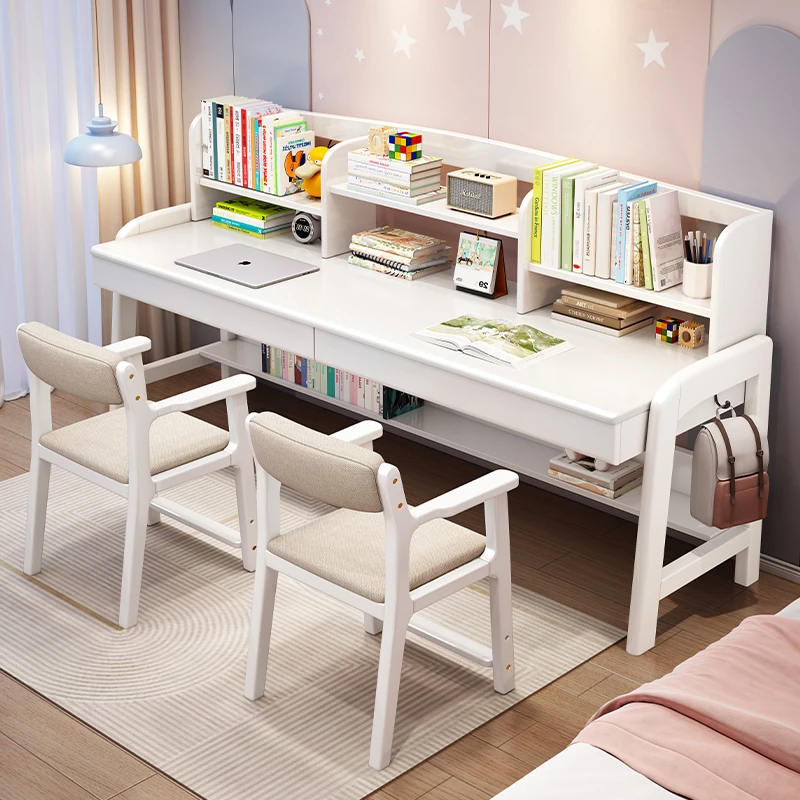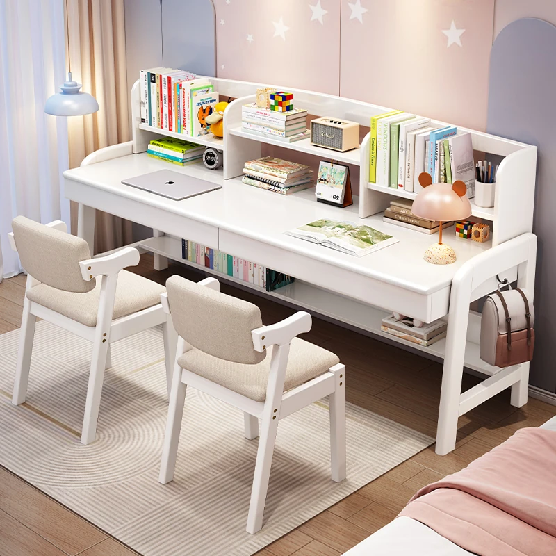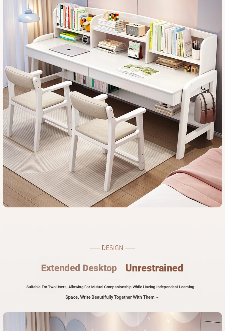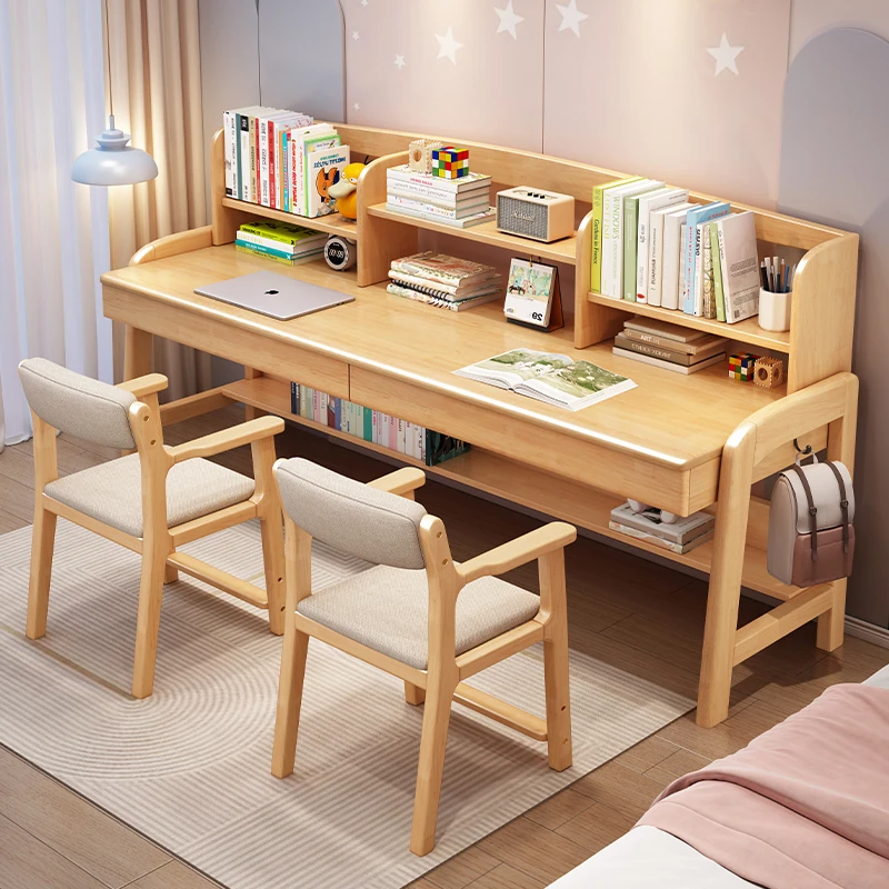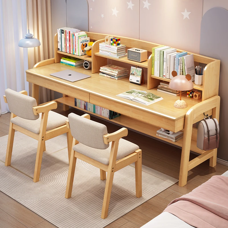 Extended Solid Wood Double Desk with Bookshelf - Ideal Learning Table for Kids and Teens, Perfect for Home or Living Room Use, Suitable for Writing and Study Sessions.