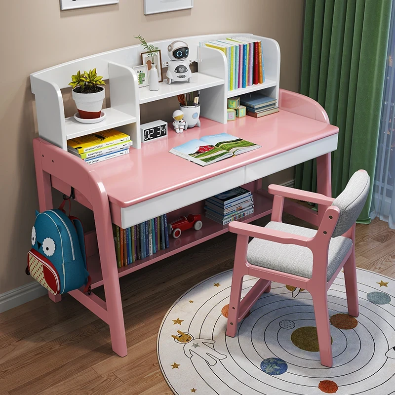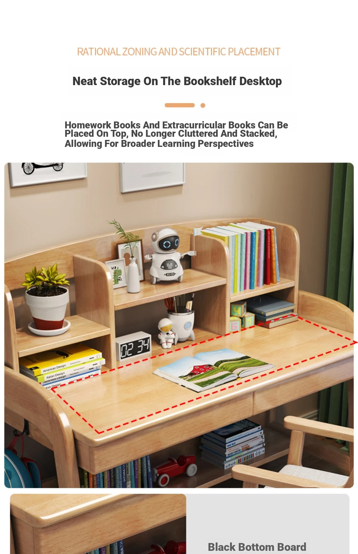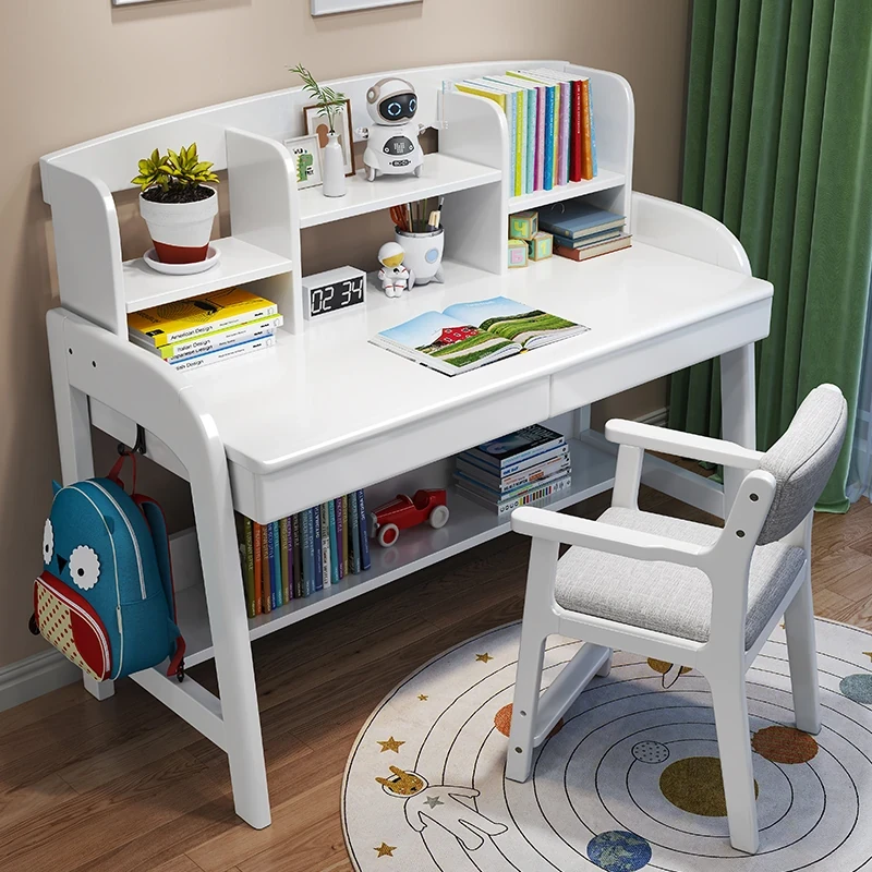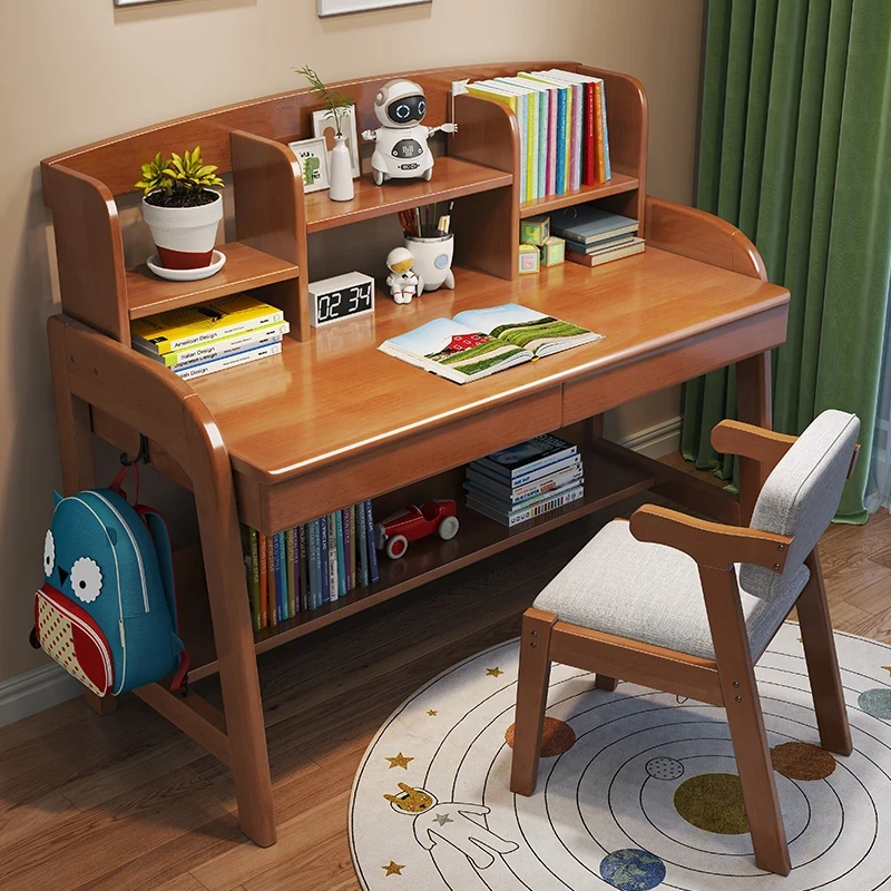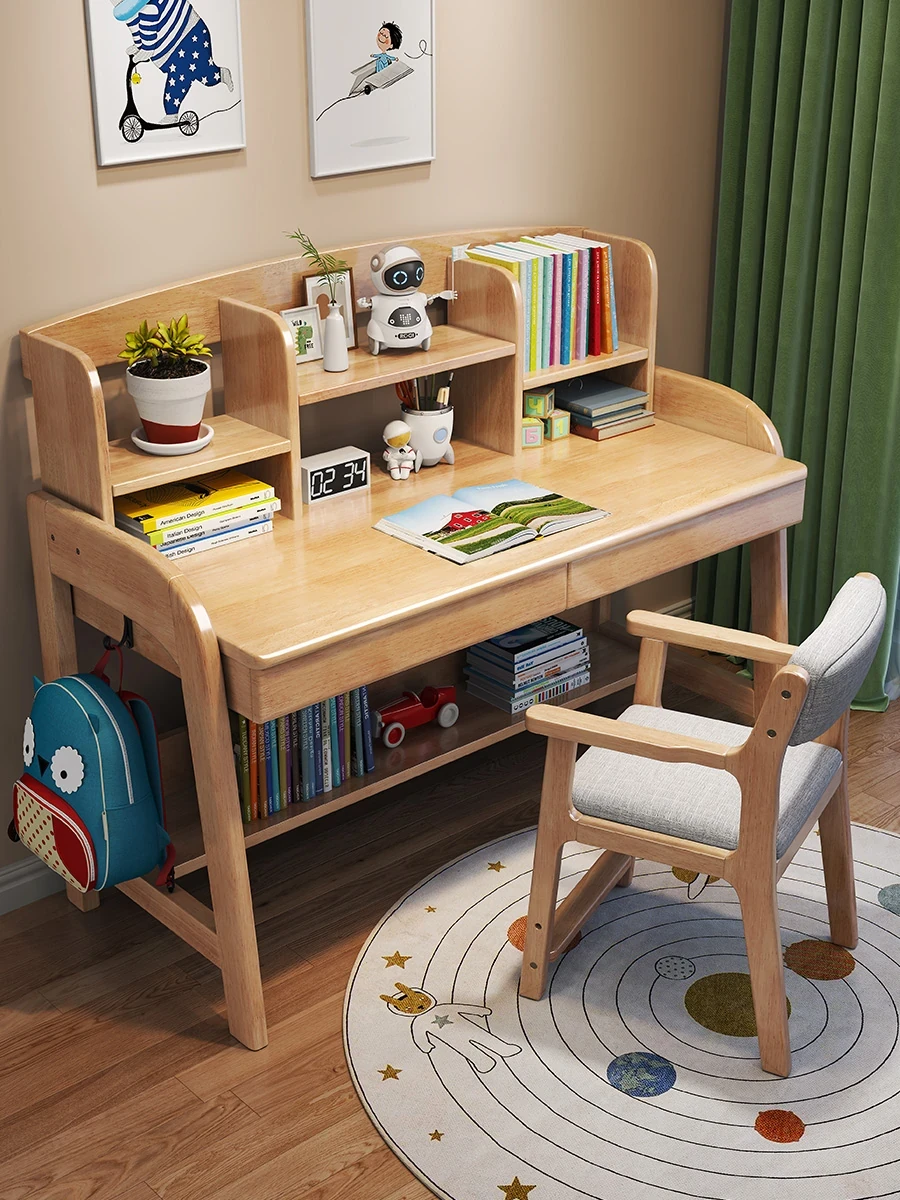 Solid Wood Children's Study Desk with Integrated Bookshelf - Adjustable Home Writing Desk Set for Middle School Students, Perfect for Bedrooms