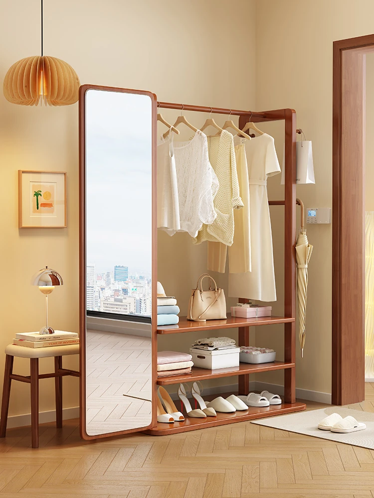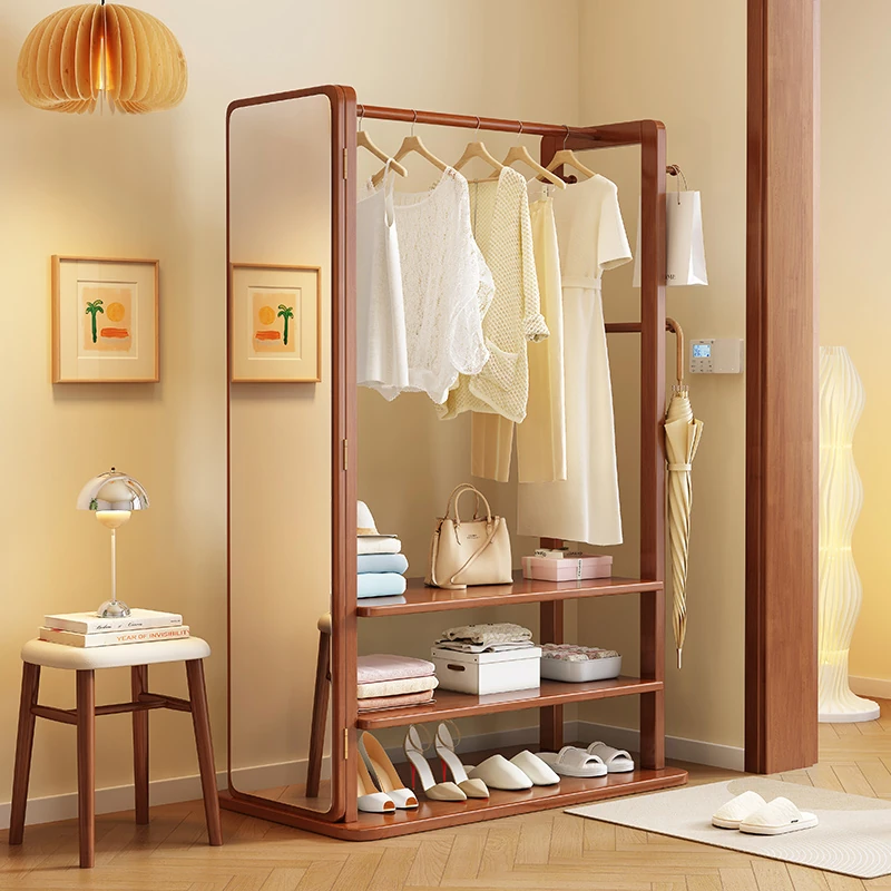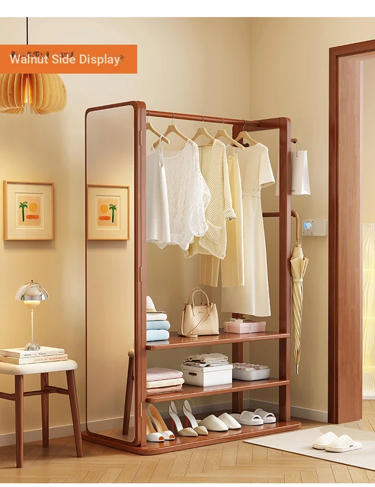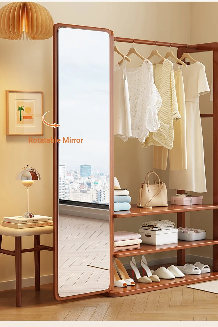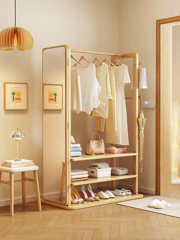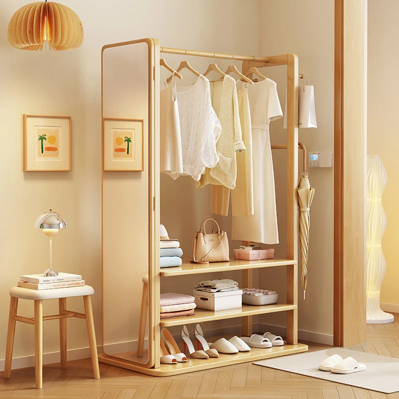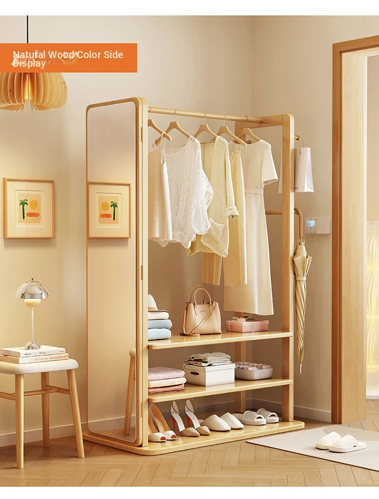 Modern Solid Wood Coat Rack with Full-Length Mirror – Minimalist Freestanding Storage Solution for Bedroom and Entryway, Perfect for Organizing Clothes and Accessories