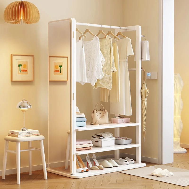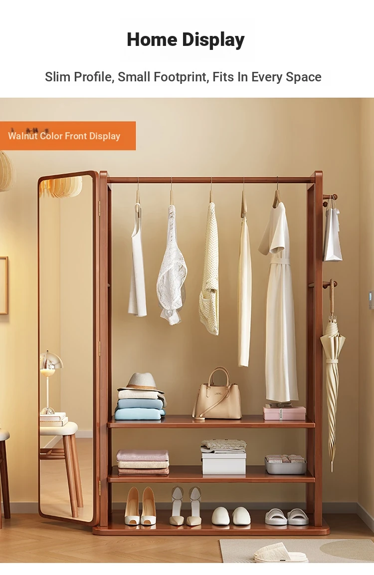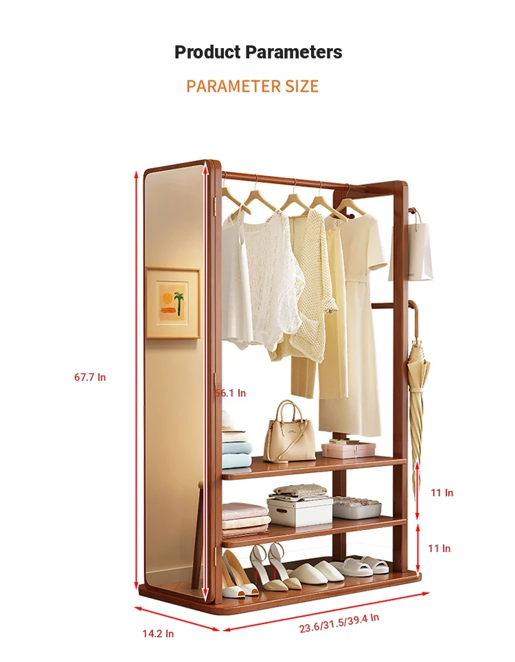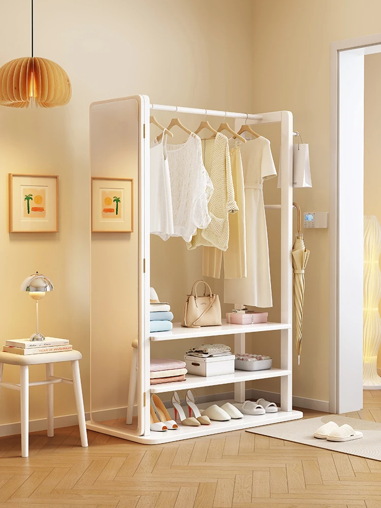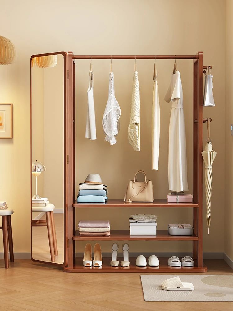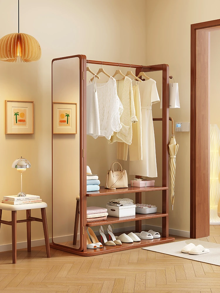 Modern Solid Wood Coat Rack with Full-Length Mirror – Minimalist Freestanding Storage Solution for Bedroom and Entryway, Perfect for Organizing Clothes and Accessories