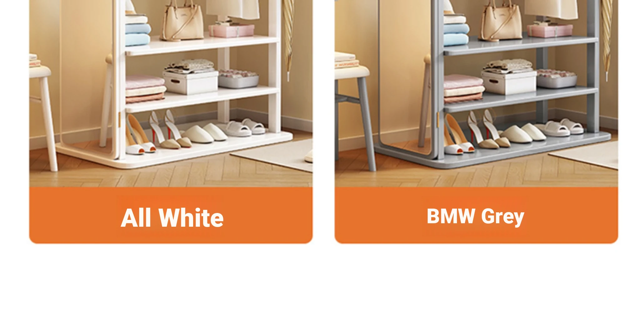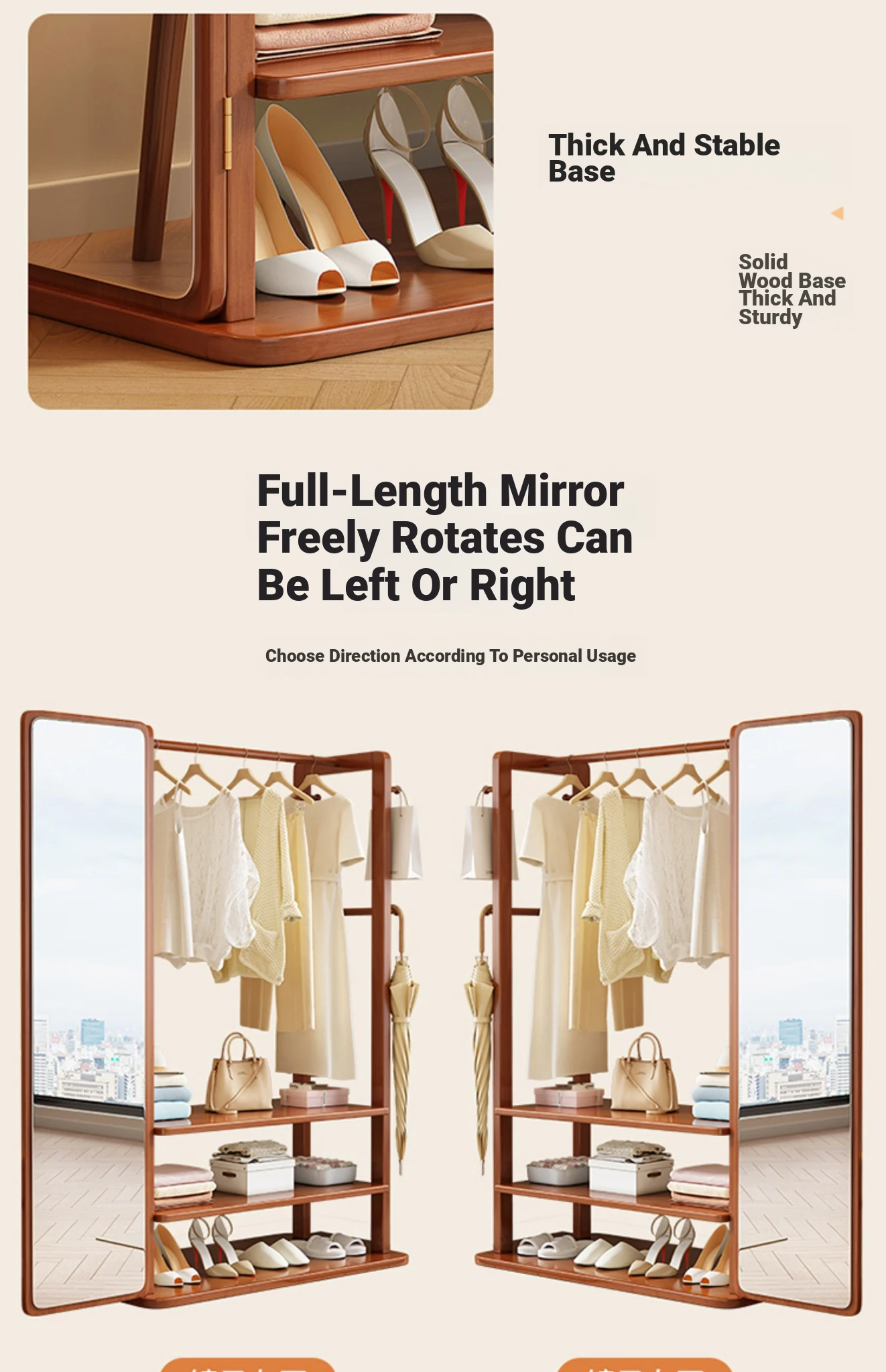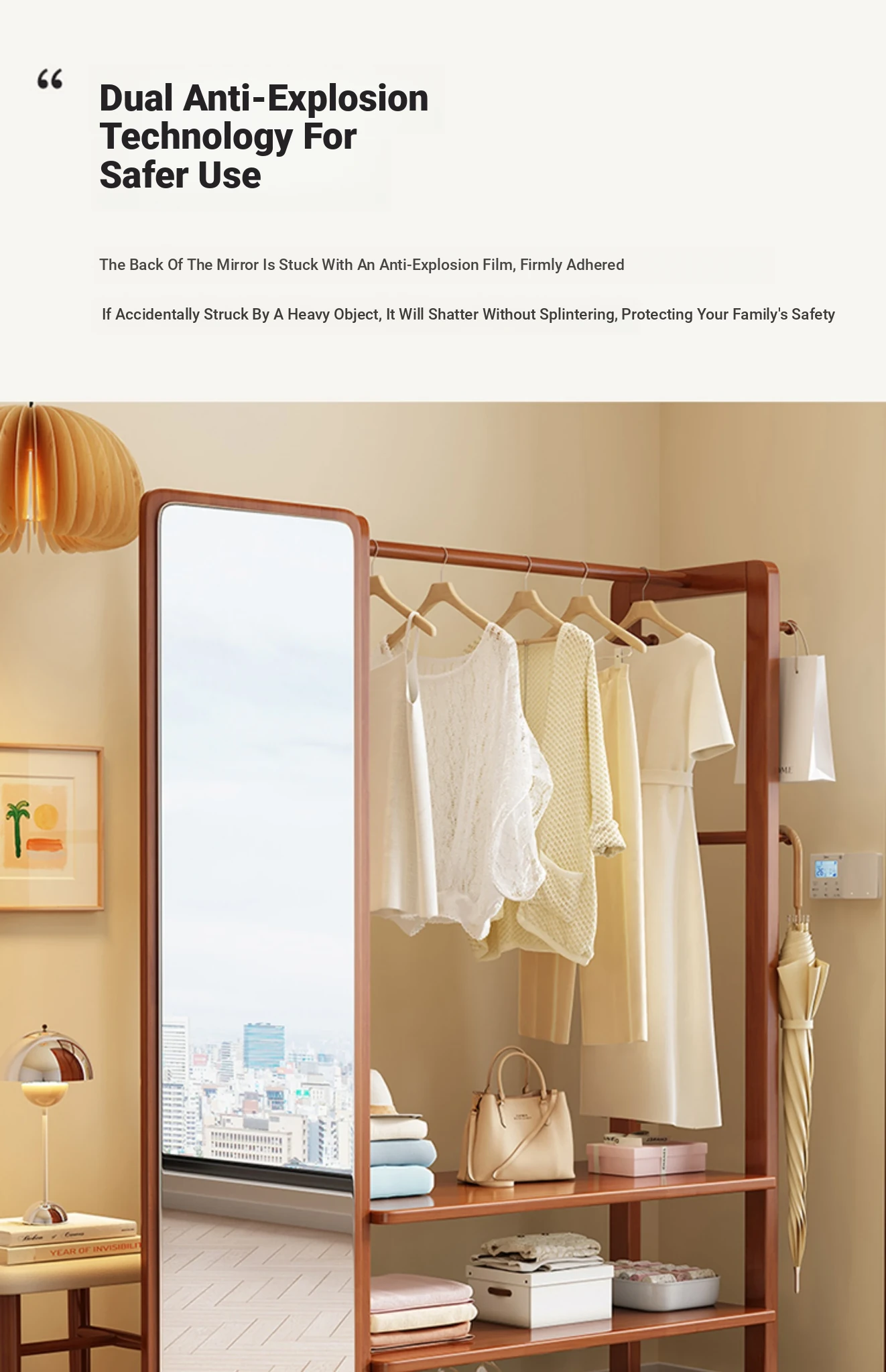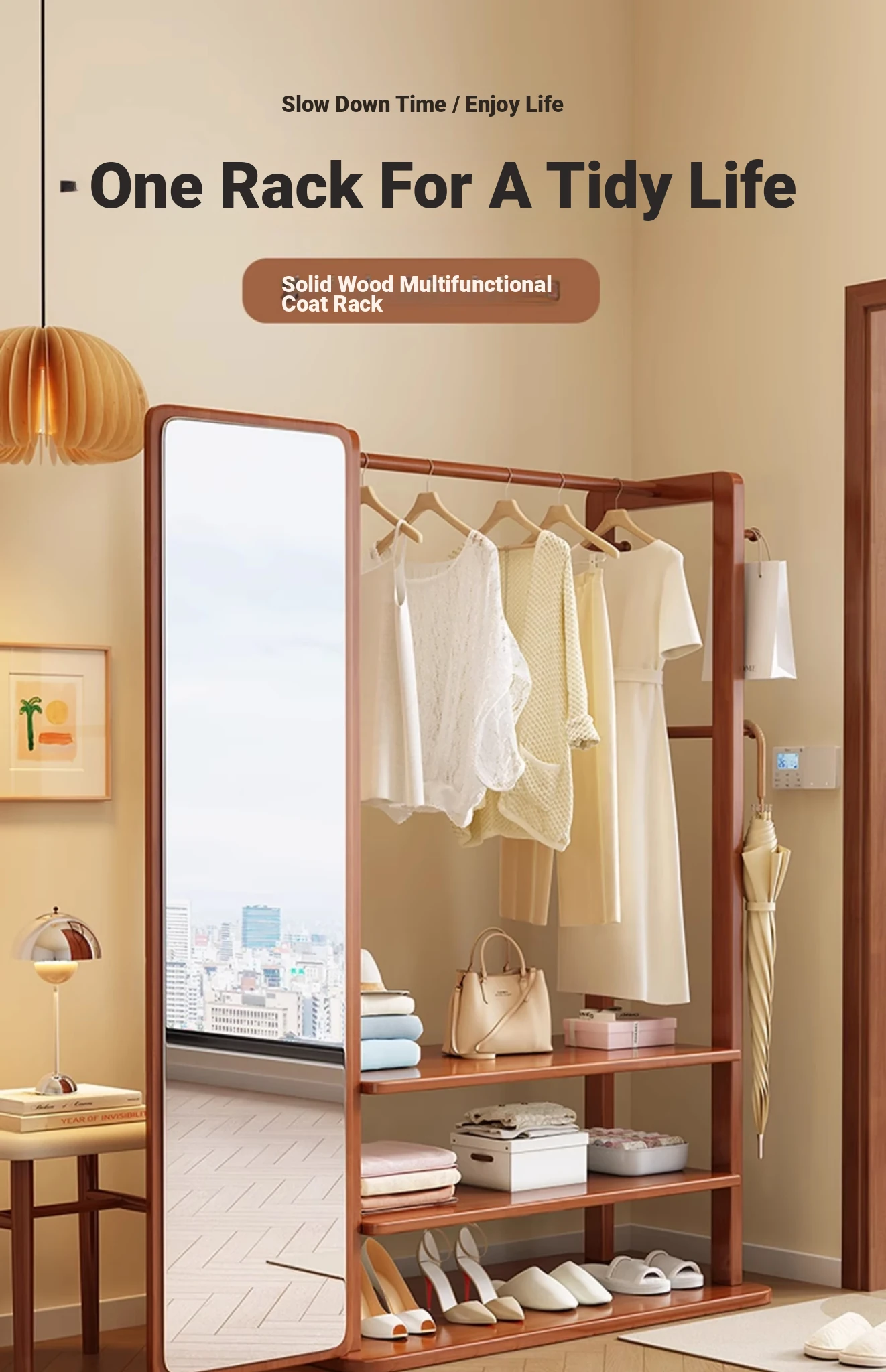 Modern Solid Wood Coat Rack with Full-Length Mirror – Minimalist Freestanding Storage Solution for Bedroom and Entryway, Perfect for Organizing Clothes and Accessories