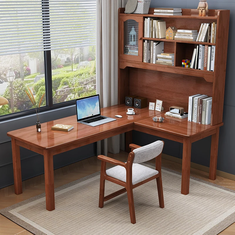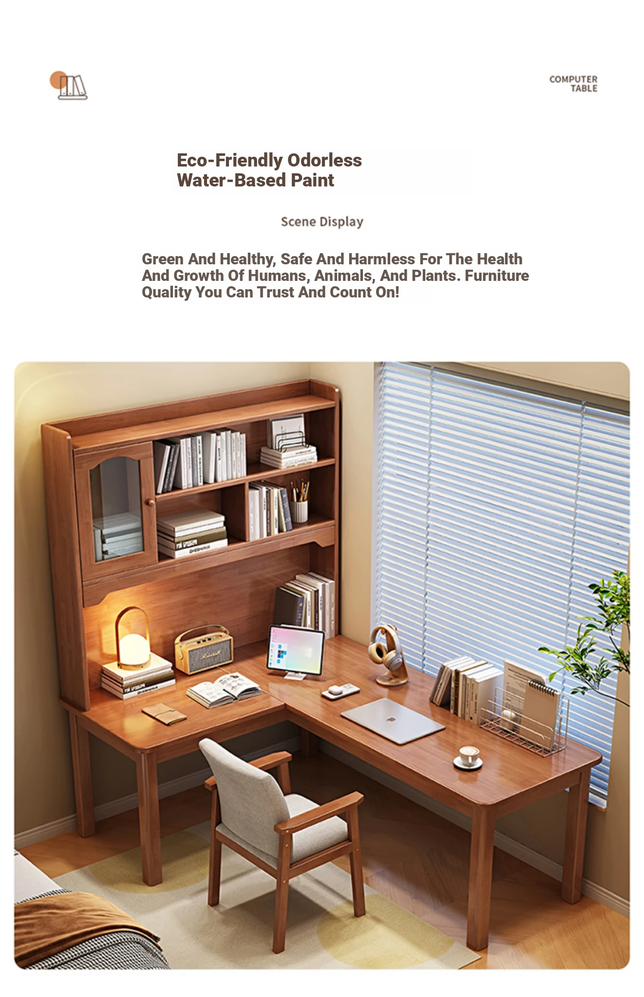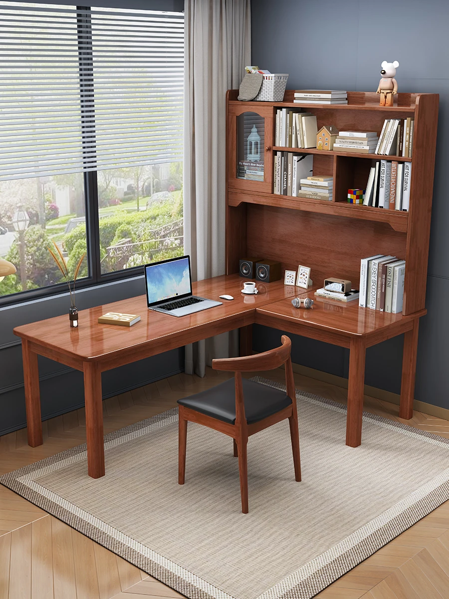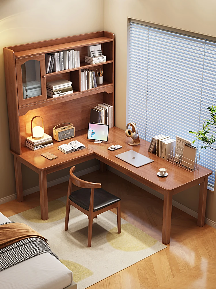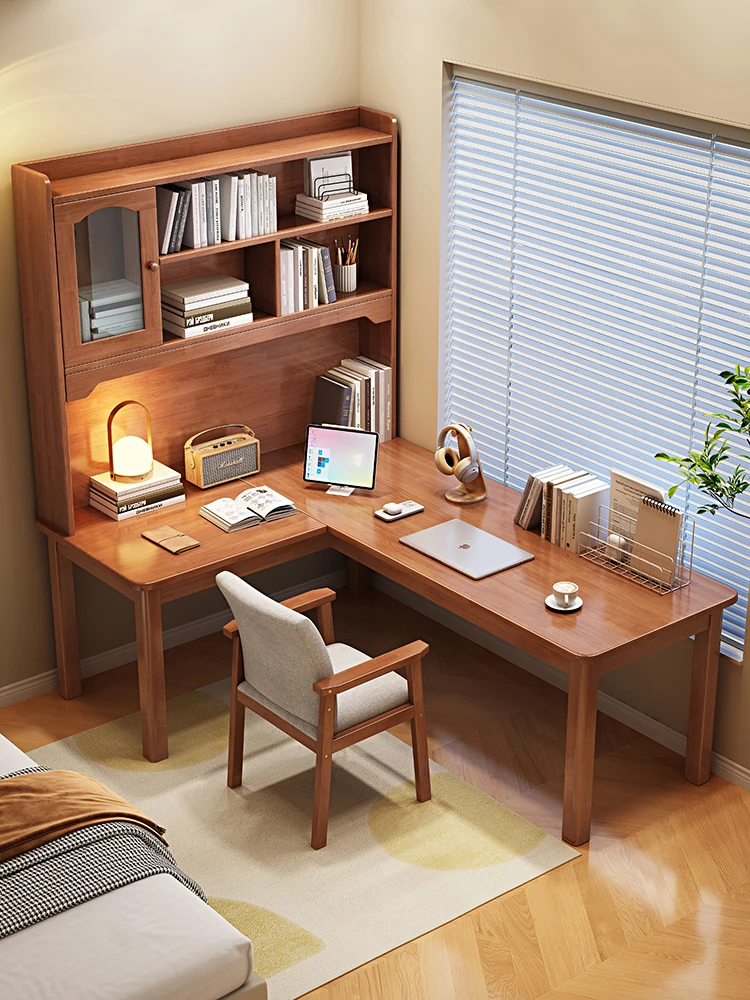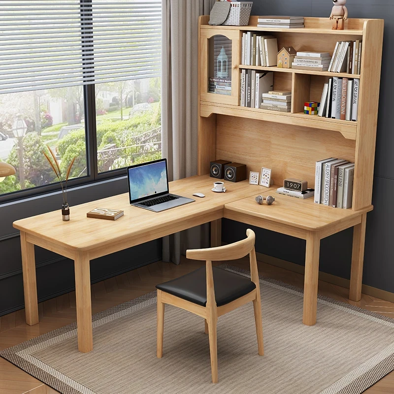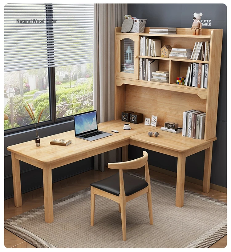 魅力のエッセンス!天然木L型デスクセット:書棚と本棚付き、学生に最適なホームオフィスコーナー用学習机