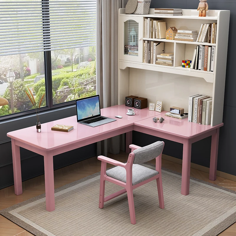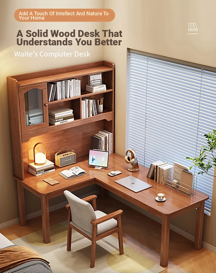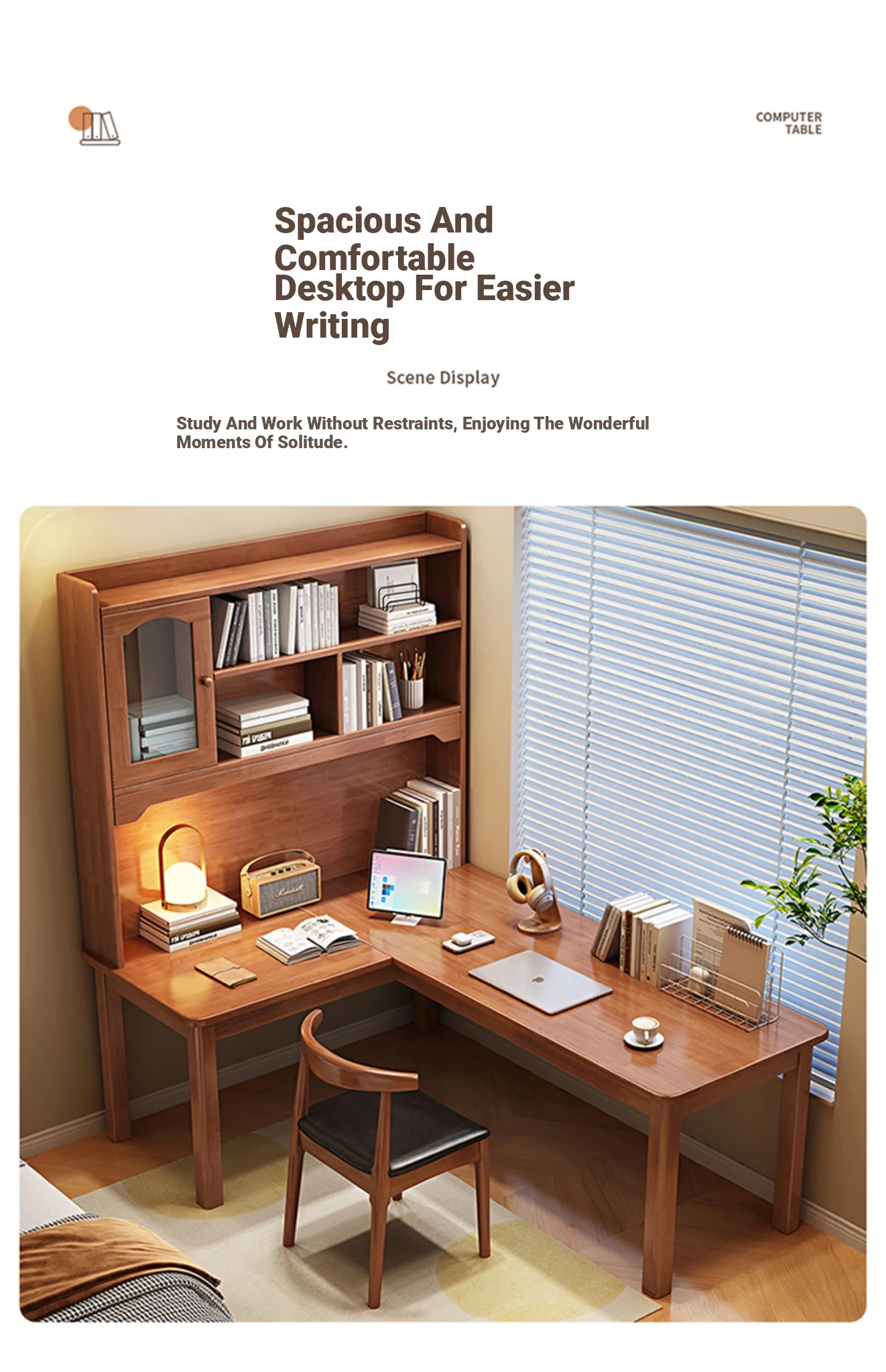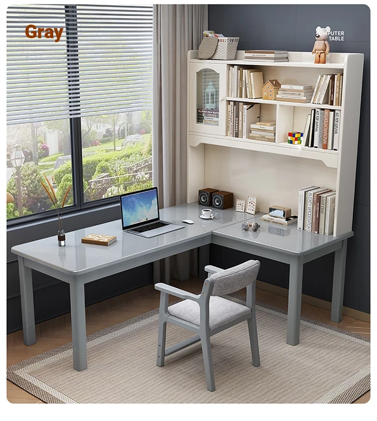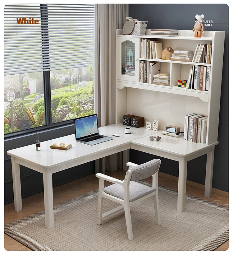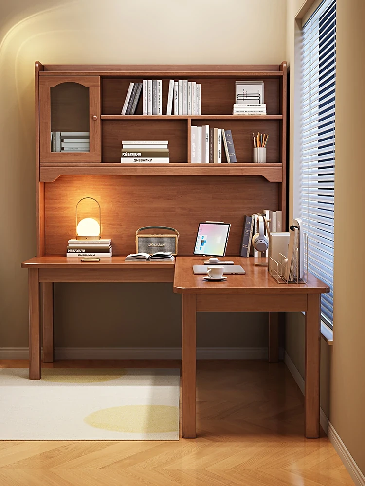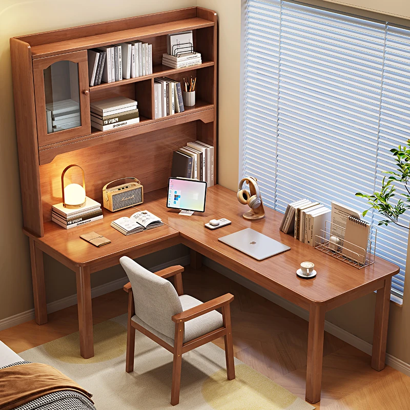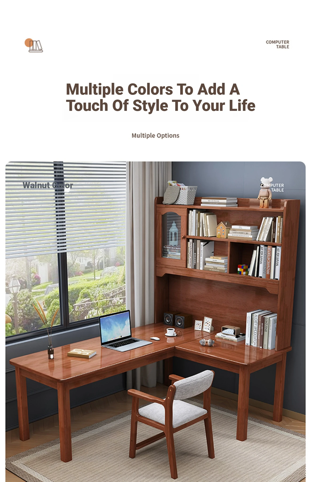 魅力のエッセンス!天然木L型デスクセット:書棚と本棚付き、学生に最適なホームオフィスコーナー用学習机