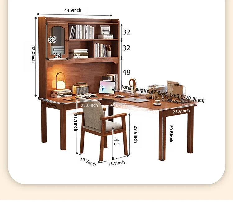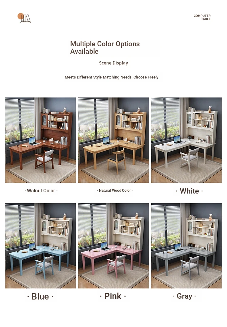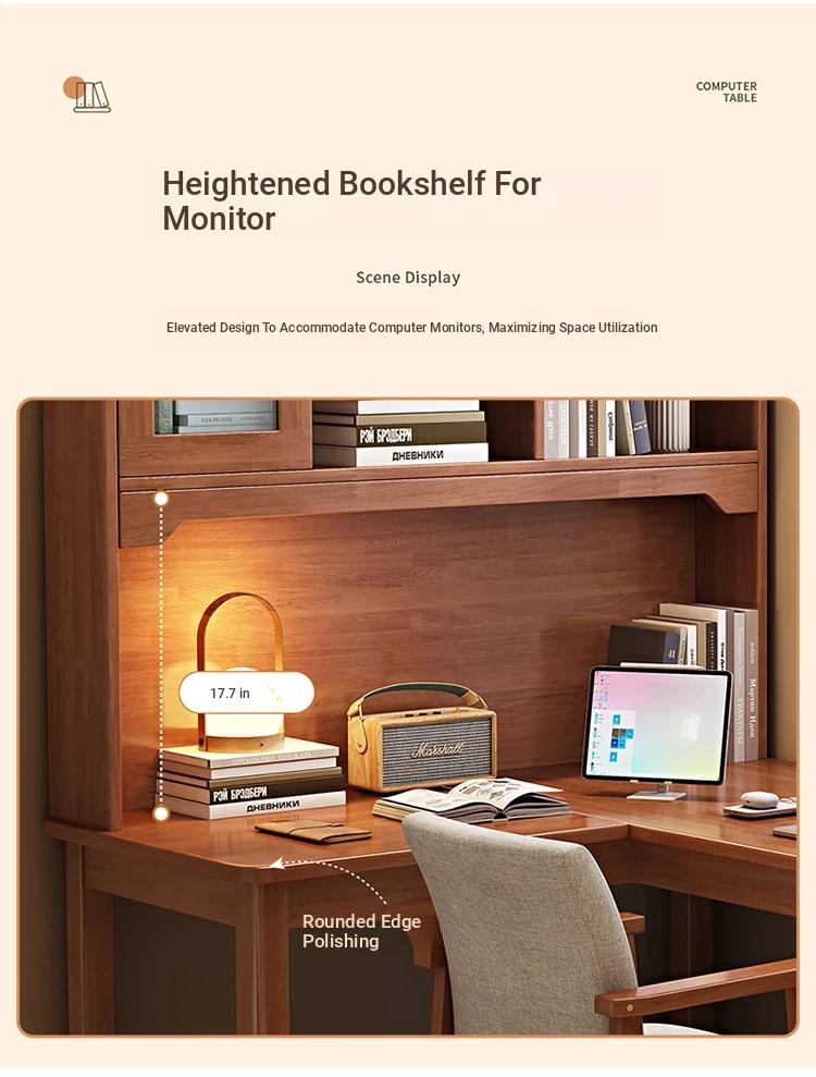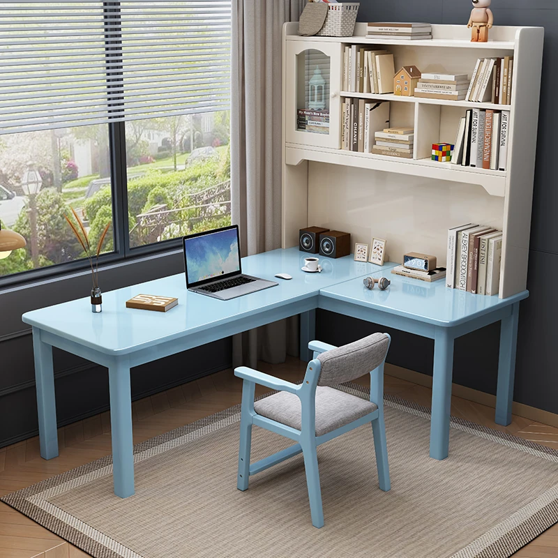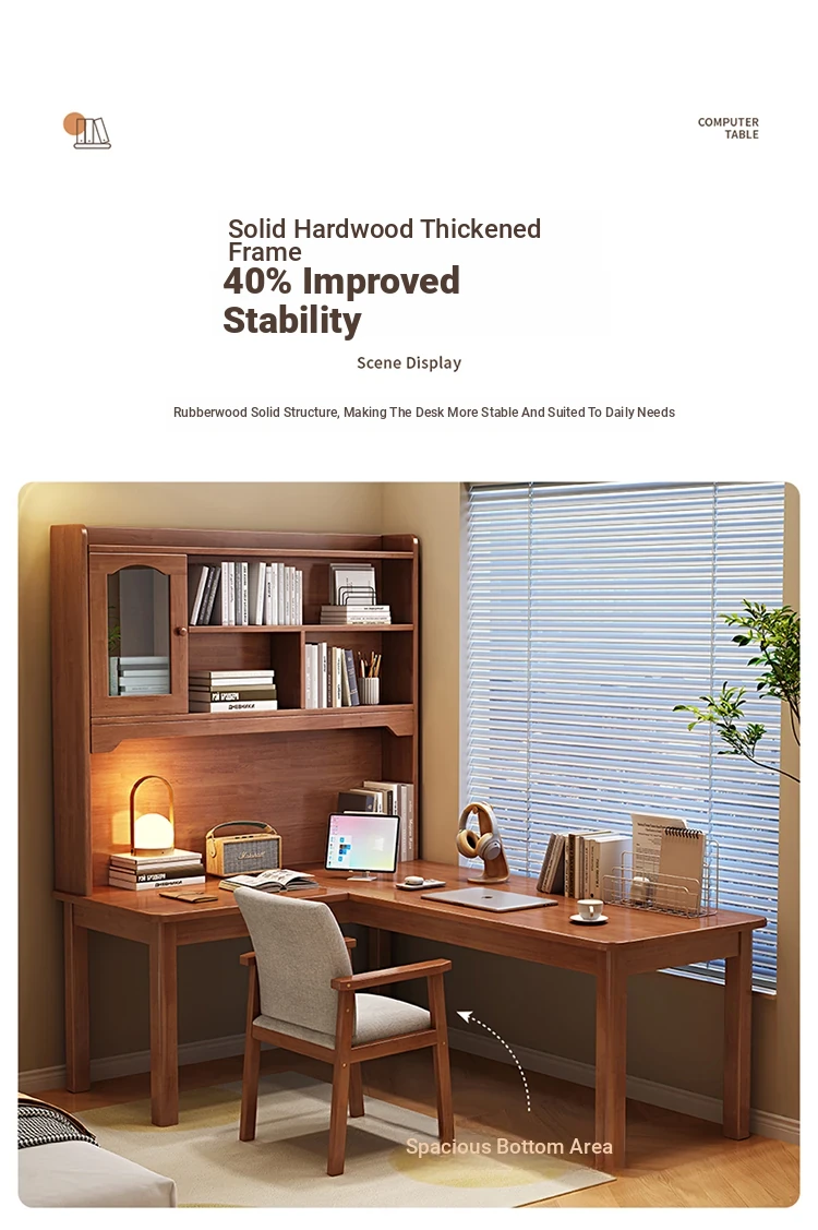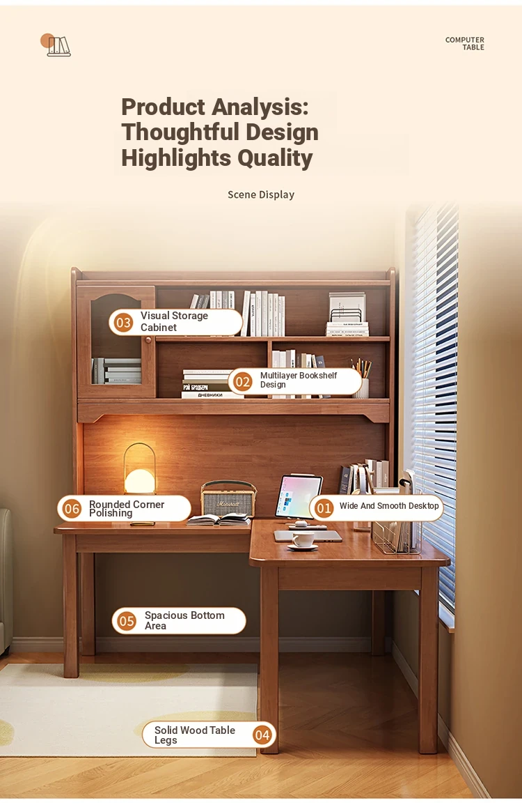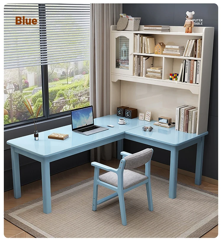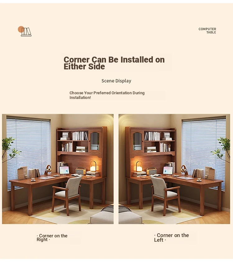魅力のエッセンス!天然木L型デスクセット:書棚と本棚付き、学生に最適なホームオフィスコーナー用学習机